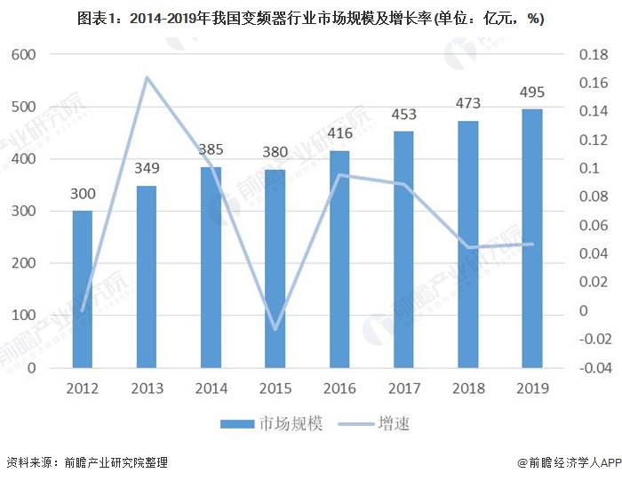 我國變頻器行業(yè)的市場規(guī)模整體呈上升態(tài)勢,從2012年至2019年,中國變頻器行業(yè)規(guī)模除2015年有小幅度下降以外,其余年份均處于穩(wěn)步增長狀態(tài)。2019年我國變頻器行業(yè)的市場規(guī)模達到495億元,相比2018年增長4.7%。