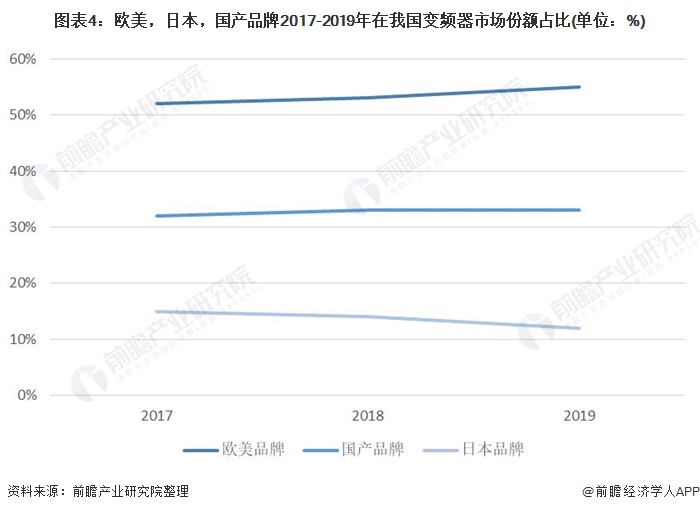 而中國國產(chǎn)變頻器企業(yè)這幾年市場份額一直在逐年增加。從各品牌的市場份額來看,外資品牌占據(jù)變頻器市場的主要份額,上世紀80年代日本企業(yè)率先進入我國的變頻器市場,之后歐美品牌大量涌入,形成了歐美與日本品牌共同主導我國變頻器市場的競爭格局。近年來,進口替代進程正在不斷推進,國產(chǎn)企業(yè)正在逐步占據(jù)日本企業(yè)市場份額。從2017年至2019年日本變頻器行業(yè)市場份額逐年下降,國產(chǎn)品牌的上升且維持在33%左右,歐美品牌則依舊是變頻器市場份額占比最高的。2019年,歐美品牌市場份額占比為55%,國產(chǎn)品牌市場份額占比為33%,日本品牌的市場份額占比為12%。