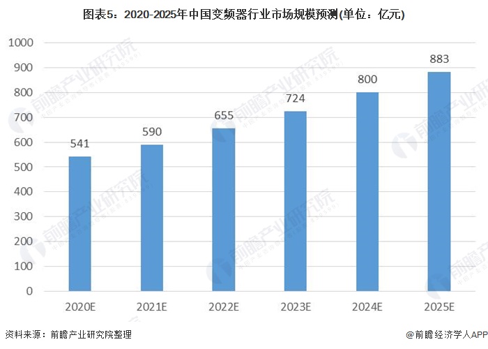 在一系列節(jié)能環(huán)保政策的指引下,預計未來5年內(nèi),變頻器將在電力、冶金、煤炭、石油化工等領域將保持穩(wěn)定增長,在市政、軌道交通、電梯等領域需求進一步增加,從而促進市場規(guī)模擴大,未來幾年整體增幅將保持在10%左右,到2025年,變頻器市場規(guī)模將達到883億元。