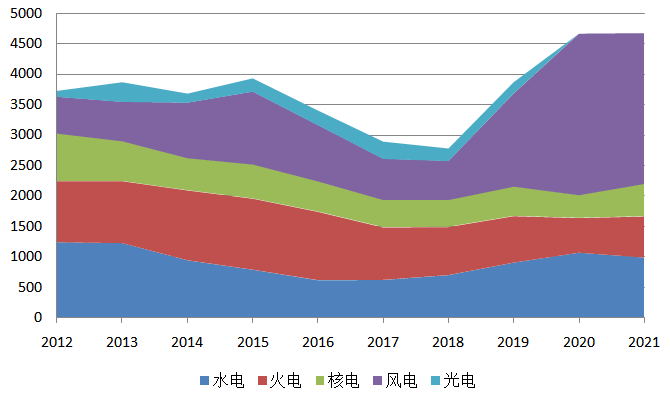 圖10 2012~2021年新增風(fēng)電、太陽(yáng)能發(fā)電裝機(jī)情況(單位:萬(wàn)千瓦)