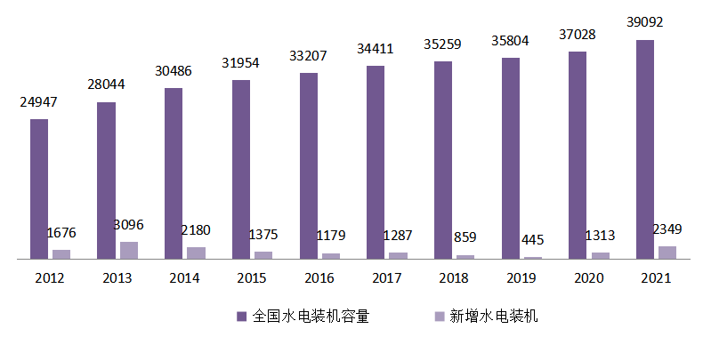 圖12 2012~2021年水電裝機(jī)和新增裝機(jī)情況(單位:萬(wàn)千瓦)