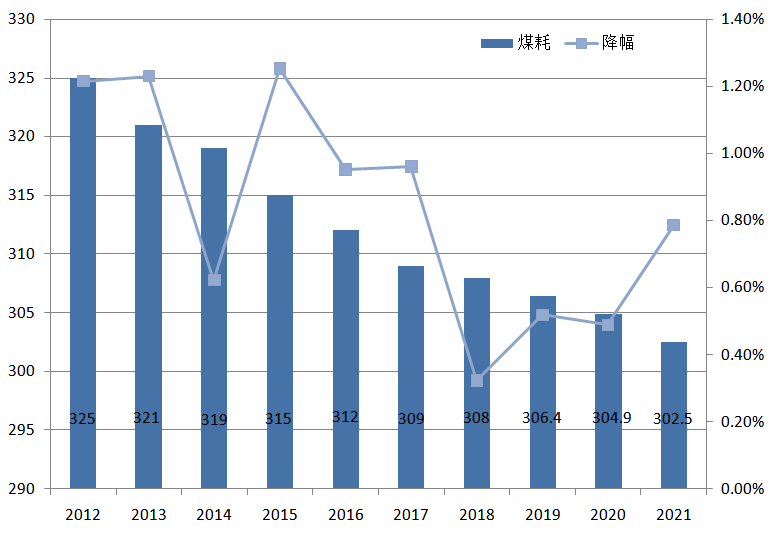 據(jù)國(guó)家能源局?jǐn)?shù)據(jù),2021年全國(guó)供電標(biāo)準(zhǔn)煤耗302.5克/千瓦時(shí),同比再降2.4克/千瓦時(shí),較2011年下降了26.5克/千瓦時(shí)。