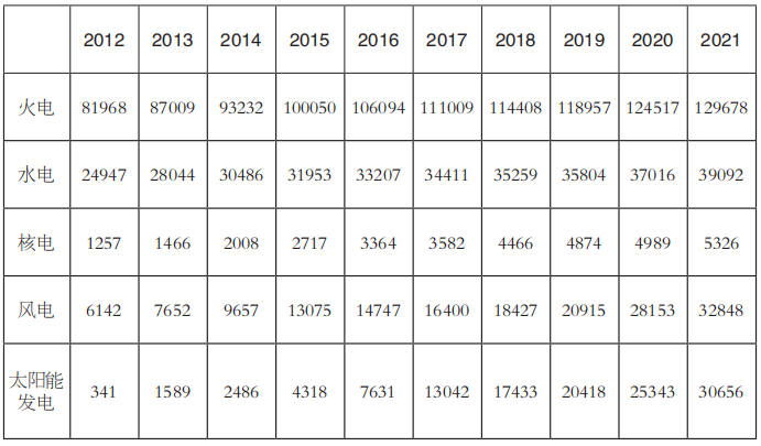 表3 2012~2021年全國(guó)電力裝機(jī)結(jié)構(gòu)(單位:萬(wàn)千瓦)