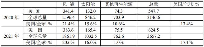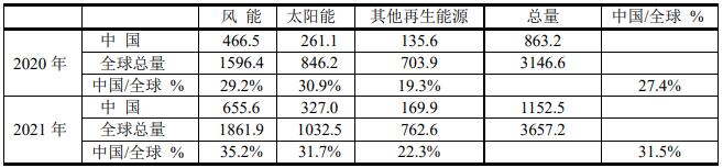 ?、?在再生能源中風(fēng)電場和光伏發(fā)展得最快,其價格已被用戶接受。根據(jù)BP 2022年報告,得出下表。中國風(fēng)能和光伏發(fā)電發(fā)電進展迅速,2021年中國占全球總量的27.4%,而同期美國為17.1%.