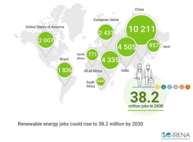 中國是太陽能光伏板的領(lǐng)先制造商和安裝商,海上風電工作崗位的數(shù)量正在增長。東南亞國家也正在成為主要的太陽能光伏制造中心和生物燃料生產(chǎn)國。