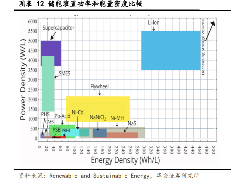在功率和能量密度方面,電化學存儲系統(tǒng),特別是鋰離子電池,與其他能源存儲設 備相比,具有平均功率密度和能量密度較高的特點。因此,鋰離子電池具有體積小的優(yōu) 勢。在最新技術中,鋰離子電池也展現出優(yōu)勢。