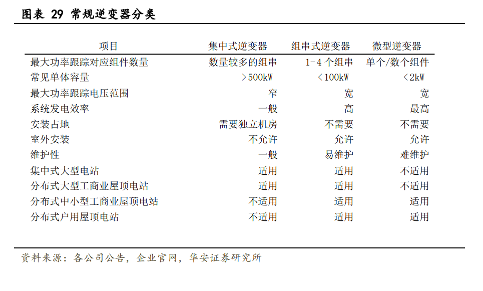 組串 PCS 彌補(bǔ)集中式不足,開啟規(guī)模化應(yīng)用。業(yè)內(nèi)目前電池儲能系統(tǒng)主要采取集中 式 PCS,多組電池并聯(lián)將引起電池簇之間的不均衡,久之并聯(lián)電池簇中會出現(xiàn)一部分電 池實際出力不足,而另一部分超出倍率使用的現(xiàn)象,造成“木桶”效應(yīng);而組串式 PCS 可 以實現(xiàn)簇級管理,提升系統(tǒng)壽命,提高全壽命周期放電容量,規(guī)?;瘧?yīng)用趨勢已見雛形。 當(dāng)前市場以組串式逆變器為主,微型逆變器尚處于發(fā)展階段。綜合考慮逆變器的不同技 術(shù)并結(jié)合其市場策略做出選擇的背景下,當(dāng)前組串式逆變器仍是市場較為主流選擇。目 前,華為、陽光電源、固德威、錦浪科技等光伏逆變器的核心供應(yīng)商均在組串式逆變器 有布局。而微型逆變器作為一種新的技術(shù)路線尚處于發(fā)展期,技術(shù)門檻較高,供應(yīng)商較 少。國外的微型逆變器市場發(fā)展較早,但出貨仍集中于海外龍頭 Enphase。我國微型逆變 器供應(yīng)商較少,一方面是因為國內(nèi)相關(guān)技術(shù)研發(fā)較晚,另一方面是因為國內(nèi)市場對于微 型逆變器的需求處于導(dǎo)入階段,尚未進(jìn)入放量階段。