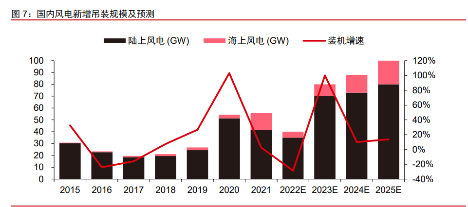 風電:受疫情等因素影響,2022 年部分風電項目裝機將延后至 2023 年。2022 年 1-11 月,國內(nèi)風電新增并網(wǎng)量達 22.52GW(-6.8% YoY),預(yù)計全年新增并網(wǎng)規(guī)模達 40GW 左 右,同比或有所回落。這主要是由于疫情影響設(shè)備生產(chǎn)交付和項目現(xiàn)場吊裝節(jié)奏,同時疊 加機型方案升級換代,以及部分項目場址審批周期拉長影響。我們預(yù)計有 10GW 左右陸上 風電項目裝機將由于外部因素由 2022 年延至 2023 年,短期裝機需求低于預(yù)期或為 2023 年需求復(fù)蘇進一步夯實基礎(chǔ)。隨著疫情影響逐步緩解,風電經(jīng)濟性大幅提升,以及 2022 年部分延遲項目結(jié)轉(zhuǎn),2023 年國內(nèi)風電裝機有望顯著復(fù)蘇,預(yù)計總裝機量將達 80GW 左 右,其中海上風電裝機有望實現(xiàn)翻倍增長至 10GW 以上,且 2023-25 年海風裝機仍有望 維持約 40%的較高 CAGR。