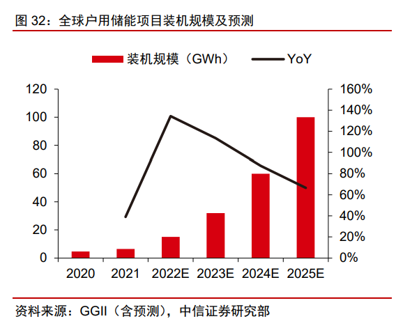 電價攀升+能源危機,推動歐洲戶儲項目經(jīng)濟性和配置意愿持續(xù)高漲。歐洲電價在近 年來天然氣價格大幅上漲情況下持續(xù)攀升,推動戶用光伏+儲能項目經(jīng)濟性顯著增強。據(jù) BNEF 統(tǒng)計,2021 年歐洲戶儲項目新增規(guī)模達 1.04GW/2.05GWh(+56%/+73% YoY)。 而 2022 年俄烏沖突進一步推升歐洲能源成本行至高位,且能源危機背景下歐洲居民配套 光儲系統(tǒng)積極性空前高漲,儲能滲透率快速提升,為未來幾年戶儲行業(yè)奠定高景氣基調(diào)。 在以歐洲為主要戶儲市場的高增長支撐下,GGII 預(yù)計全球戶儲市場容量將由 2021 年的 6.4GWh 大幅增至 2025 年的 100GWh。