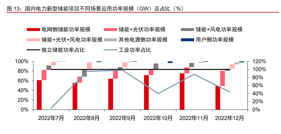 其三,電網(wǎng)側(cè)獨立儲能與電源配儲為主,用戶側(cè)工商業(yè)占比逐漸提升。從應(yīng)用場景來 看,新型儲能項目主要集中于電網(wǎng)側(cè)(100%為獨立儲能)與電源側(cè)配儲(95%為新能源 配儲)。用戶側(cè)儲能項目功率規(guī)模占比仍較低,但其中工業(yè)項目占比逐步穩(wěn)定在 50%以上。