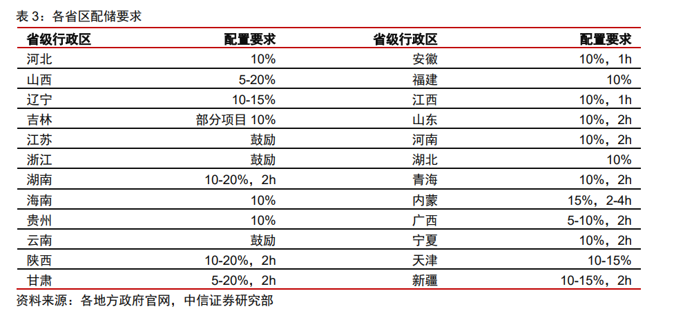 各地區(qū)逐步明確風光配儲要求,推動發(fā)電側(cè)儲能發(fā)展。隨著國家多部委的儲能政策出 臺和持續(xù)細化,各地方政府也在積極響應(yīng)和明確新增發(fā)電項目的強制性配儲要求,配儲比 例在 5%-10%,配儲時長為 2-4 小時。除少數(shù)省份為部分項目配儲和鼓勵性配儲要求之外, 90%以上的地區(qū)都提出強制性配儲要求。現(xiàn)實需求和政策推動是未來幾年國內(nèi)儲能裝機的 主要驅(qū)動因素。