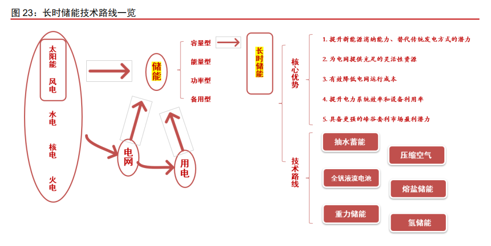 新能源滲透率快速提升,疊加其出力的不穩(wěn)定性,推升儲能市場需求,電力系統(tǒng)的儲 能應(yīng)用存在多種時間尺度需求,長時儲能(一般指 4h 以上)成為儲能發(fā)展的重要方向, 在電力系統(tǒng)中具備多種優(yōu)勢——長時儲能具備提升新能源消納能力、替代傳統(tǒng)發(fā)電方式的 潛力,可以為電網(wǎng)提供充足的靈活性資源,可有效降低電網(wǎng)運行成本,具備更強的峰谷套 利和市場盈利潛力。