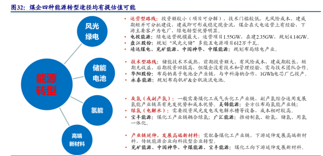 (1)風光綠電。風光綠電轉型為運營型轉型路線,是煤企能源轉型的主要路徑之一,該路徑具有投資額較小、項目可分解、技術門檻相對較低、風險成本低等特點。風光綠電建成期短并可分批建設,建成即能形成穩(wěn)定的現(xiàn)金流。由于大部分煤企具有坑口火電廠,煤炭下游客戶主要為電廠,煤企具有一定的電力運營能力,風光綠電轉型具有明顯優(yōu)勢,是煤企轉型初期的主要路徑。電投能源:上市煤企中風光綠電運營規(guī)模最大,運營項目1.55GW,在建2.35GW,規(guī)劃4.14GW。盤江股份:規(guī)劃發(fā)展風電、光伏、火電、抽水蓄能項目612萬千瓦,“風光火儲”多能互補,前景廣闊。靖遠煤電、兗礦能源、中國神華、中煤能源:規(guī)劃布局綠電產(chǎn)業(yè)。
