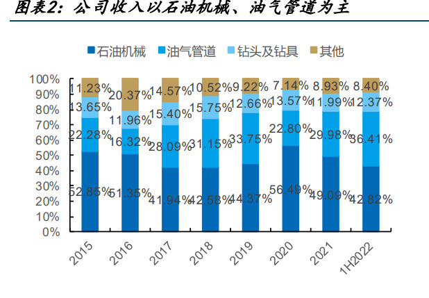 公司收入以石油機械、油氣管道為主,石油機械貢獻主要毛利。1H22 公司石油機械與油 氣管道貢獻 79.23%收入,油氣管道毛利率較低,毛利主要由石油機械貢獻。
