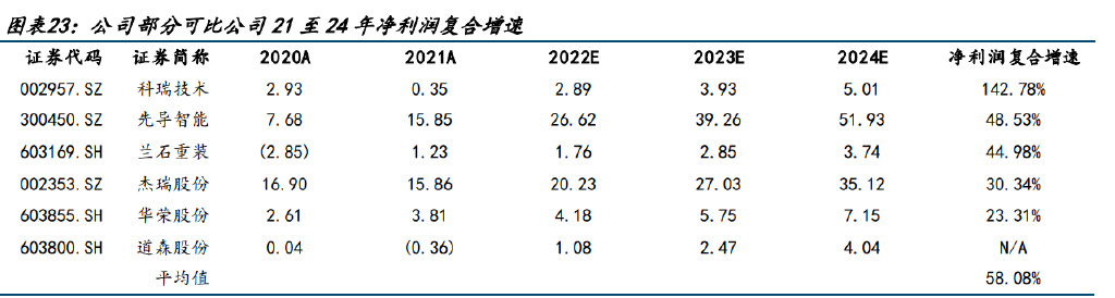 從部分有Wind一致預期的公司看,21至24年凈利潤復合增速5家企業(yè)平均值為54.85%, 其中蘭石重裝、先導智能預計復合增速分別約為 45%、49%,科瑞技術高達 143%,考慮其 余企業(yè)中仍有企業(yè)有望實現(xiàn)高復合增速,公司要超過 75 分位值水平(高于第五)預計凈 利潤復合增速較高,我們預計公司 21 至 24 年凈利潤復合增速為 49.69%。