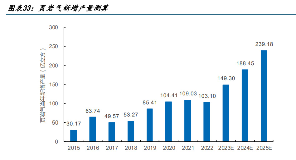 對于頁巖氣產量的遠期預測,我們結合《頁巖氣發(fā)展規(guī)劃 2016-2020》展望的 2030 年實 現(xiàn)頁巖氣產量 800 至 1000 億立方,與中國頁巖氣當前勘探開發(fā)、技術進步、設備總體形 式預測,預計 25 年頁巖氣產量有望占到天然氣產量的 15%,即頁巖氣產量在 25 年達到 460 億方,22 至 25 年 CAGR22.62%。