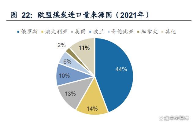 歐盟化石能源進口高度依賴俄羅斯,2021年歐盟煤炭、天然氣進口量中分別44%、 41%來自俄羅斯,俄烏沖突導(dǎo)致歐洲面臨能源價格和供應(yīng)的雙重危機。長遠(yuǎn)來看, 歐盟實現(xiàn)能源獨立將從兩方面著手:一是多元化進口天然氣氣源,二是加速能源轉(zhuǎn) 型,提高能效,減少對化石能源的依賴,歐盟對煤炭的需求或?qū)⒊掷m(xù)下降。 煤炭:歐盟的煤炭供給量逐年下降至2021年的4.87億噸,較2000年的8.31億噸減少 41.4%,同時同步減少煤炭本土產(chǎn)量和進口量,對外依存度保持在20%~25%。從煤 炭進口來源看,歐盟煤炭前三大進口國是俄羅斯(占比44%)、澳大利亞(占比14%)、 美國(占比13%);德國和波蘭為本土的產(chǎn)煤大國,合計產(chǎn)量占?xì)W盟總產(chǎn)量的70%。