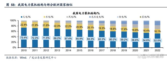 部分歐洲國家與我國電力結構相似,能源轉(zhuǎn)型過程值得借鑒。從我國電力裝機結構來看,過去我國以傳統(tǒng)電源火電、水電為主,2010年兩者裝機占比96%,風光等可 再生能源逐漸成為發(fā)展重點,水電、火電裝機占比下降,2022年火電裝機占比52%, 水電開發(fā)已進入后半程增量有限,風光成為新增裝機主力,這與部分歐洲國家如德 國、波蘭頗為相似,2022年德國煤電發(fā)電量占比已經(jīng)降至31%,風光發(fā)電量占比提 升至32%,其能源轉(zhuǎn)型走在我國之前。隨著我國提出雙碳目標,風光占比提升成為 必然趨勢,德國等歐洲國家能源轉(zhuǎn)型過程中的經(jīng)驗對我國有重要的借鑒意義。
