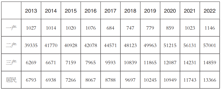 表1 2013—2022年分產(chǎn)業(yè)用電量(單位:億千瓦時)