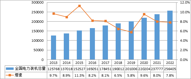 圖3 2013—2022年全國(guó)電力裝機(jī)及增速情況(單位:萬(wàn)千瓦)