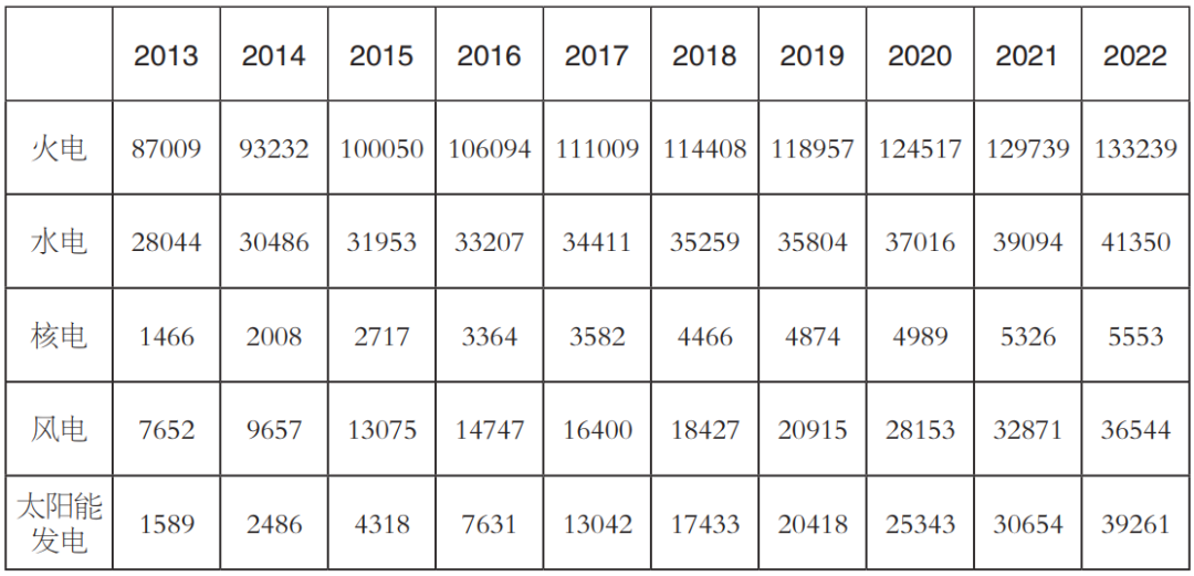 表4 2013-2022年全國(guó)電力裝機(jī)結(jié)構(gòu)(單位:萬(wàn)千瓦)
