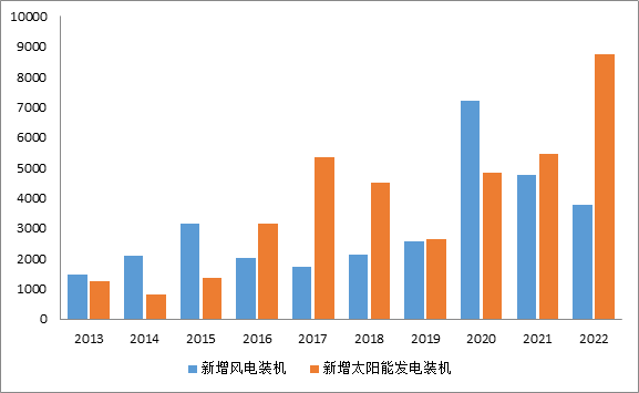 圖9 2013—2022年新增風(fēng)電、太陽(yáng)能發(fā)電裝機(jī)情況(單位:萬(wàn)千瓦)