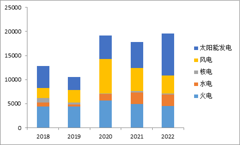 2018、2019兩年新增裝機(jī)規(guī)模連續(xù)下滑。2020年,在水電、風(fēng)電、太陽(yáng)能發(fā)電裝機(jī)高速增長(zhǎng)的帶動(dòng)下,新增裝機(jī)容量大幅提升。2021年受火電、風(fēng)電新增裝機(jī)容量減少的影響,整體新增規(guī)模同比出現(xiàn)下滑。2022年,在火電、核電、風(fēng)電新增裝機(jī)增速負(fù)增長(zhǎng)情況下,太陽(yáng)能發(fā)電新增裝機(jī)容量增速達(dá)約60%,拉高全年新增裝機(jī)增速。