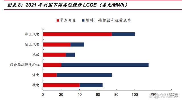 核電項目初期建設(shè)投資高,但綜合考慮運(yùn)營、燃料、廢物處理費(fèi)用后的全生命周 期成本后,競爭力凸顯。即使三代核電造價提升,其經(jīng)濟(jì)性仍然很強(qiáng)。而且國內(nèi)核電 設(shè)計壽命 40-60 年有余量,到期后一般會申請延壽 20 年,進(jìn)一步增強(qiáng)了核電的盈利 能力。用平準(zhǔn)化度電成本 LCOE 來評測,根據(jù) IEA 測算,2021 年我國壓水堆核電站 LCOE 約為 65 美元/MWh,僅次于光伏的 35 美元/MWh 和陸風(fēng)的 45 美元/MWh,且 相對煤電具有優(yōu)勢。作為基荷能源,考慮長期運(yùn)營成本,從成本端對火電、燃?xì)獍l(fā)電 擁有極強(qiáng)替代能力。