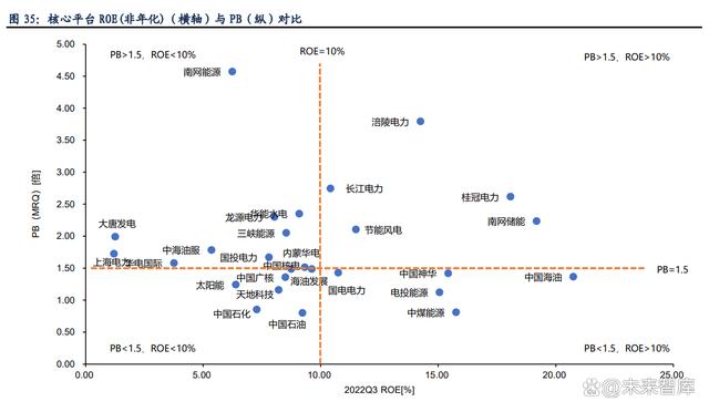 在 PB-ROE 模型中,全部 A 股上市公司的數(shù)據(jù)如下:2023/3/30 的 PB 為 1.57(MRQ), 2022 前三季度 ROE 為 8.99%。因此,我們將 PB=1.5,roe =10%作為標準進行篩選,對 PB 估值較低且資產收益率較高的核心平臺分為以下三類: (1) 第一類,ROE 大于 10%且 PB 小于 1.5 的公司:中煤能源,中國海油,中國神華, 電投能源,國電電力。 (2) 第二類,PB 略大于 1.5 但 ROE 表現(xiàn)良好的公司:節(jié)能風電。 (3) 第三類,ROE 略低于 10%且 PB 較低的公司:中國石油,中國廣核,中國石化,海 油發(fā)展,天地科技,中國核電。 從中長期來看,二級市場對股票的估值水平通常會隨著公司盈利能力的增強而上升,即 PB 與 ROE 理論上應當呈現(xiàn)正相關關系。我們認為,以上公司是目前處于低估狀態(tài)的能源央企 核心平臺,估值修復空間較大。