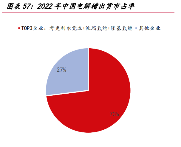 電氫賽道風起云涌,電解槽系統(tǒng)率先放量,2022 年國內電解槽設備出貨量同比 2021 年翻倍。2021 年之前,聚焦電解水制氫設備制造的廠商主要包括派瑞氫能、考 克利爾競立、天津大陸等深耕多年的頭部企業(yè),2021 年起,風電、光伏、氫能產(chǎn)業(yè)鏈 企業(yè)先后布局電解槽業(yè)務,行業(yè)出貨量大增。據(jù) GGII 統(tǒng)計,2021/2022 年中國電解 水制氫設備出貨量分別約 350MW/722MW。 電解槽行業(yè)仍處于高速增長階段,競爭格局尚不穩(wěn)定。2021 年,考克利爾競立 (出貨量 160MW)、派瑞氫能、山東賽克賽斯氫能位居電解槽出貨量前三;2022 年考 克利爾競立(出貨量 230MW,占比 31.9%)、派瑞氫能、隆基氫能(首次切入前三)位 居出貨量前三,行業(yè) CR3 達 73%,同比 2021 年下降約 10 個百分點。 從產(chǎn)能來看,據(jù)勢銀 (Trend Bank)統(tǒng)計,2022 年中國堿性電解槽企業(yè)已披露產(chǎn) 能接近 11GW,質子交換膜制氫設備的產(chǎn)能已超過百兆瓦級。堿性電解水制氫路線相 對成熟,投資成本低,當前占據(jù)主導地位。