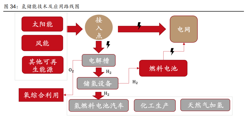 與其他儲(chǔ)能方式相比,氫能更能滿足大規(guī)模、長時(shí)間消納需求。與抽水儲(chǔ)能、鋰電池儲(chǔ)能 等方式相比,其具有邊際成本低、能量密度大、無自衰減等優(yōu)勢,能夠?qū)崿F(xiàn)跨周、跨季儲(chǔ) 能。但其實(shí)際應(yīng)用需要經(jīng)過光伏發(fā)電到制氫再由儲(chǔ)氫發(fā)電的兩次轉(zhuǎn)換,短期內(nèi)儲(chǔ)能效率較 低。鋰電儲(chǔ)能的效率更高,適用于日度調(diào)峰;氫能更針對于大規(guī)模儲(chǔ)能和季度調(diào)峰,擴(kuò)容 只需要增加儲(chǔ)氫設(shè)備,邊際成本更低。