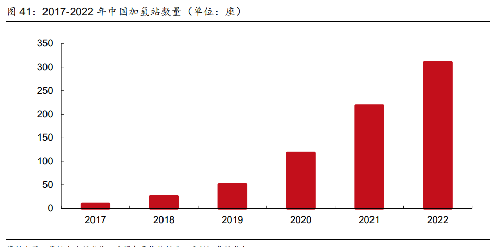 加氫站布局加快,逐漸形成網(wǎng)絡(luò)。加氫站等基礎(chǔ)設(shè)施是否完善是影響消費(fèi)者購買氫燃料電 池汽車熱情的主要因素。隨著國內(nèi)氫燃料電池汽車?yán)塾?jì)銷量增加,中石化、中石油等能源 央企不斷加大加氫基礎(chǔ)設(shè)施的投資和建設(shè)力度,國內(nèi)加氫站數(shù)量呈現(xiàn)快速增長趨勢。截至 2022 年底,我國加氫站累計(jì)建成數(shù)量達(dá)到 274 座。根據(jù) 2020 年中國汽車工程學(xué)會(huì)發(fā)布 的《節(jié)能與新能源汽車技術(shù)路線圖 2.0》相關(guān)規(guī)劃,到 2035 年加氫站的建設(shè)目標(biāo)為至少 5000 座,中國未來加氫基礎(chǔ)設(shè)施的市場規(guī)模在 2030-2050 年將突破千億。此外,我國加 氫站建設(shè)參與主體呈現(xiàn)多樣化趨勢,采取規(guī)?;ㄔO(shè)或加油/加氫/加氣站合建等方式來拓 展加氫基礎(chǔ)設(shè)施網(wǎng)絡(luò),單位加注成本也有望下降。