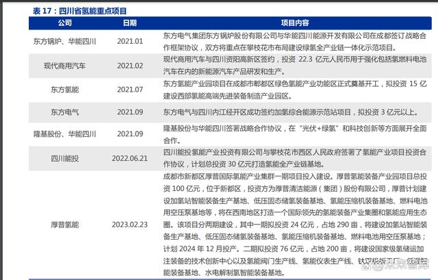 近年來四川省不斷落地氫能投資項(xiàng)目,產(chǎn)業(yè)蓄勢待發(fā)。2021年以來,四川省積極引導(dǎo)氫能項(xiàng)目投資落地:1)2021年2月24日,現(xiàn)代商用汽車在四川資陽投資22.3億元,重點(diǎn)強(qiáng)化氫燃料汽車在內(nèi)的新能源汽車產(chǎn)品的研發(fā)和生產(chǎn);2)2021年7月9日,東方氫能在四川成都市郫都區(qū)投資15億元建設(shè)西部氫能高端先進(jìn)裝備制造產(chǎn)業(yè)園區(qū),主要目的是導(dǎo)入四川省燃料電池重點(diǎn)實(shí)驗(yàn)室,打造氫能科技創(chuàng)新中心、制造中心、科普中心、運(yùn)維服務(wù)及大數(shù)據(jù)中心、應(yīng)用示范中心,積極引入產(chǎn)業(yè)上下游企業(yè),構(gòu)建燃料電池核心原材料及核心零部件企業(yè)集群;3)2021年9月8日,東方電氣與四川內(nèi)江經(jīng)開區(qū)簽約并擬投資3億元建設(shè)的加氫綜合能源示范站項(xiàng)目;4)2022年6月21日,四川能投氫能產(chǎn)業(yè)投資有限公司計(jì)劃在攀枝花市總投資30億元打造氫能全產(chǎn)業(yè)鏈基地。