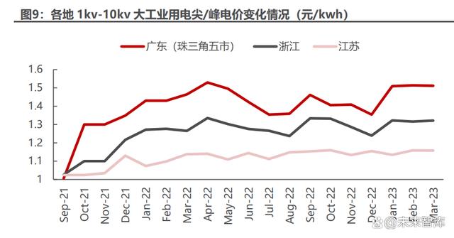 “分時電價”、“電力市場化”政策驅動,大工業(yè)平均用電價格提高。2021 年 下半年全國大部分省份陸續(xù)出臺分時電價政策,調整峰谷電價及峰谷時段,其中以 江蘇、廣東、浙江為例的經濟發(fā)達省份率先、多次調整,峰谷價差有較大幅度的擴 大,尖、峰時段也有不同程度的延長,大工業(yè)平均用電價格提高。
