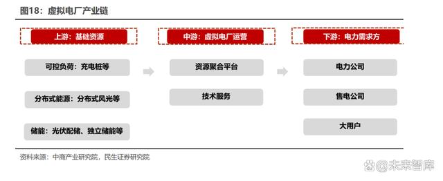 虛擬電廠產(chǎn)業(yè)鏈包括:上游基礎(chǔ)資源、中游虛擬電廠運(yùn)營、下游電力需求方。 上游基礎(chǔ)資源由可控負(fù)荷、分布式能源與儲(chǔ)能構(gòu)成;中游是提供運(yùn)營服務(wù)與技術(shù)支 持的虛擬電廠運(yùn)營平臺(tái);下游則由電力公司、售電公司、工業(yè)企業(yè)、商業(yè)用戶等電 力需求方構(gòu)成。
