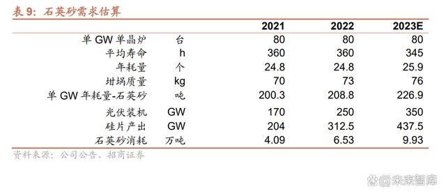 石英坩堝是硅片生產(chǎn)過程中的消材,目前尚無替代品。石英坩堝主要應(yīng)用于光伏 及半導(dǎo)體領(lǐng)域的拉晶環(huán)節(jié),是硅片生產(chǎn)流程中的關(guān)鍵材料。在硅棒拉制過程中, 石英坩堝逐步向方石英轉(zhuǎn)化,一定時(shí)間后無法使用,需要更換新的石英坩堝,在 硅片環(huán)節(jié)生產(chǎn)過程中具備較強(qiáng)的消耗品屬性。 石英坩堝原材料為高純石英砂,目前與高純石英砂比較相似的產(chǎn)品是合成石英砂, 但因成本及微量元素含量的限制,無法使用于光伏領(lǐng)域。 預(yù)計(jì) 2023 年石英砂供需偏緊。需求方面,預(yù)計(jì) 2023 年全球光伏裝機(jī) 350GW, 假設(shè)每100GW硅片的石英消耗為1.8-2萬噸,則石英砂需求預(yù)計(jì)9.3-10.3萬噸; 供給方面,尤尼明+TQC 合計(jì) 2.5-3 萬噸產(chǎn)能,石英股份 4.5-5 萬噸,其他產(chǎn)能 合計(jì)約為 1 萬噸,供給預(yù)計(jì)在 8-9 萬噸。 此外,2023 年海外石英砂占總產(chǎn)能比重約為 35%左右,整體看,行業(yè)內(nèi)石英坩 堝使用壽命會(huì)下降,石英砂需求會(huì)進(jìn)一步提升,2023 年石英供需緊張相對(duì)明確, 漲價(jià)時(shí)間及幅度可能會(huì)超預(yù)期。