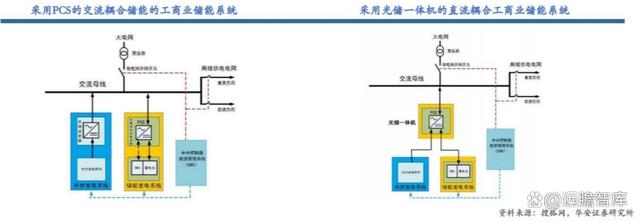 商業(yè)儲(chǔ)能系統(tǒng)架構(gòu)主要有兩種:1)采用 PCS 的交流耦合型;2)采用光儲(chǔ)一體機(jī)的直流耦合型。交流耦合系統(tǒng)與儲(chǔ)能電站的系統(tǒng)配置類似,但相對(duì)用量較小,系統(tǒng)功能也更為簡(jiǎn)單,其中的光伏系統(tǒng)和儲(chǔ)能系統(tǒng)并聯(lián),靈活性較高,適用于已安裝工商業(yè)光伏的存量市場(chǎng)。直流耦合系統(tǒng)通過(guò)光儲(chǔ)一體機(jī)將光伏逆變器和雙向變流器整合在一起,相比交流耦合系統(tǒng)具有高度集成化、軟性成本低的特點(diǎn),50-100kW 的光儲(chǔ)一體機(jī)已逐漸成為中小工商業(yè)儲(chǔ)能系統(tǒng)的選擇。