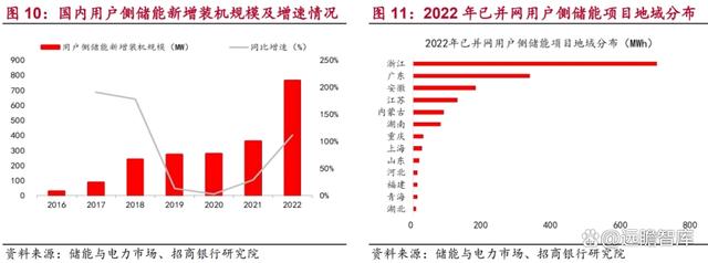 我國(guó)工商業(yè)用戶側(cè)儲(chǔ)能起步于 2016 年左右,早期主要依靠國(guó)家出臺(tái)的相關(guān)支持政策推動(dòng),隨著工商業(yè)儲(chǔ)能商業(yè)模式持續(xù)成熟清晰,工商業(yè)用戶側(cè)儲(chǔ)能新增裝機(jī)規(guī)模提速明顯。截至 2022 年,國(guó)內(nèi)用戶側(cè)儲(chǔ)能新增裝機(jī)規(guī)模達(dá) 764.73MW,同比增速超過(guò) 100%,其中工商業(yè)儲(chǔ)能占用戶側(cè)新增裝機(jī)規(guī)模的 80%-90%左右,并且主要集中在浙江、廣東、安徽、江蘇等地,對(duì)于國(guó)內(nèi)市場(chǎng)而言預(yù)計(jì)未來(lái)用戶側(cè)儲(chǔ)能將以工商業(yè)用戶為主,未來(lái)空間廣闊。