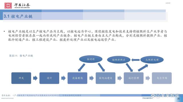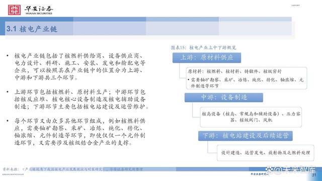 核電產(chǎn)業(yè)鏈包括了核燃料供給商、設(shè)備供應(yīng)商、 電力設(shè)計(jì)、科研、施工、安裝、發(fā)電和輸配電等 企業(yè),可以按照其在產(chǎn)業(yè)鏈中的位置分為上游、 中游和下游共三個(gè)環(huán)節(jié)。 上游環(huán)節(jié)包括核燃料、原材料生產(chǎn);中游環(huán)節(jié)包 括核反應(yīng)堆、核電核心設(shè)備制造及核電輔助設(shè)備 制造;下游環(huán)節(jié)主要包括核電站建設(shè)及運(yùn)營維護(hù)。 每個(gè)環(huán)節(jié)又由眾多其他環(huán)節(jié)組成,例如核燃料供 應(yīng),需要鈾礦勘察、采礦、冶煉、純化、轉(zhuǎn)化、 鈾濃縮、元件制造等環(huán)節(jié),即使僅僅一個(gè)元件制 造環(huán)節(jié),又需要涉及核級鋯合金產(chǎn)業(yè)的支撐。