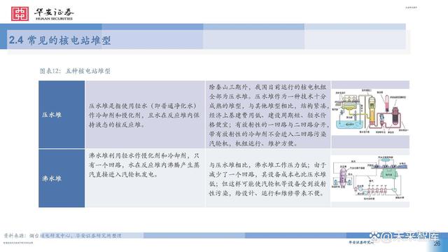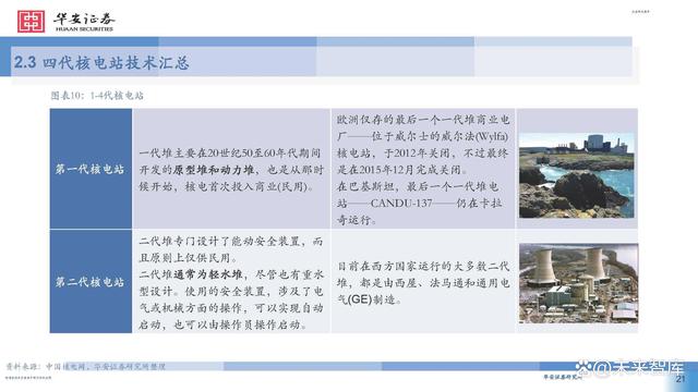 目前世界主流核電站皆采用第二代或第三代核電技術(shù)。其中,第二代和第三代的 主要核電堆型包括壓力堆和沸水堆等,在安全性和經(jīng)濟(jì)性上較前一代都有提升。第四代核電技術(shù)以在安全 性、經(jīng)濟(jì)性、核廢物處理、防止核擴(kuò)散上更為出色,代表堆型包括鈉冷快堆、鉛冷快堆、氣冷快堆、超高 溫氣冷堆等,目前主要研發(fā)試驗(yàn)階段,商業(yè)化預(yù)計(jì)在2030年左右實(shí)現(xiàn)。