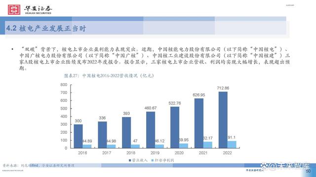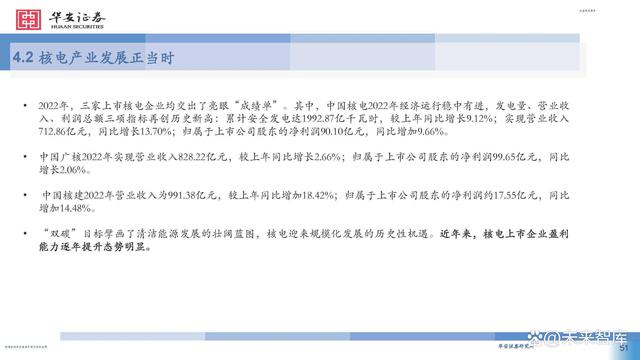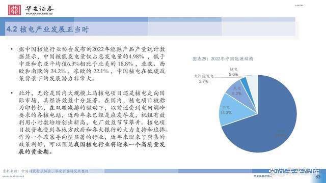 據(jù)中國核能行業(yè)協(xié)會發(fā)布的2022年能源產(chǎn)品產(chǎn)量統(tǒng)計(jì)數(shù) 據(jù)顯示,中國核能發(fā)電量僅占總發(fā)電量的4.98% ,低于 中亞和東亞平均值6.3%相比于北美的 18.8% ,北歐、西 歐和南歐的 24.2% ,東歐的 22.1% ,中國核電在低碳政 策背景下的發(fā)展?jié)摿Ψ浅4蟆?此外,無論是國內(nèi)大規(guī)模上馬核電項(xiàng)目還是核電走向國 際市場,其經(jīng)濟(jì)效益十分顯著。在國內(nèi),核電項(xiàng)目被稱 為印鈔機(jī),在雙碳減排的驅(qū)動下,以前還受到電網(wǎng)調(diào)峰 要求的各核電站,近兩年來已經(jīng)是應(yīng)發(fā)盡發(fā),機(jī)組有效 利用小時(shí)數(shù)紛紛創(chuàng)出新高,電廠效益節(jié)節(jié)攀升。核電項(xiàng) 目投資也受到各地方政府和各大銀行的大力支持和追捧。 作為一個(gè)政策導(dǎo)向型顯著的行業(yè),近年來迎來了密集的 政策利好,可以預(yù)見我國核電行業(yè)將迎來一個(gè)高質(zhì)量發(fā) 展的黃金期。