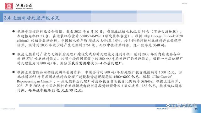 根據(jù)中國核能行業(yè)協(xié)會數(shù)據(jù),截至 2022 年 6 月 30 日,我國在運(yùn)核電機(jī)組共 54 臺(不含臺灣地區(qū)), 在建核電機(jī)組 23 臺,在運(yùn)裝機(jī)容量為 55805.74MWe(額定裝機(jī)容量)。根據(jù)《bp Energy Outlook:2020 edition》的相關(guān)數(shù)據(jù)分析,中國核電的年均 增速為 5.4%至 6.0%,按 5.4%的增速對乏燃料產(chǎn)出做保守 估算,預(yù)計(jì)到 2035 年最少將產(chǎn)生乏燃料 2764 噸,而以中值估算的話,這一數(shù)字是 3040 噸。