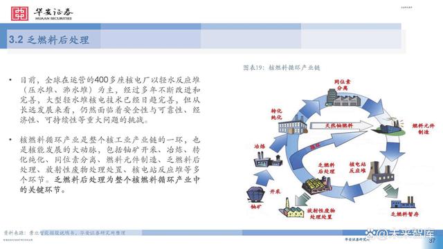 目前,全球在運(yùn)營的400多座核電廠以輕水反應(yīng)堆 (壓水堆、沸水堆)為主,經(jīng)過多年不斷改進(jìn)和 完善,大型輕水堆核電技術(shù)已經(jīng)日趨完善,但從 長遠(yuǎn)發(fā)展來看,仍然面臨著安全性與可靠性、經(jīng) 濟(jì)性、可持續(xù)性等重大問題的挑戰(zhàn)。 核燃料循環(huán)產(chǎn)業(yè)是整個(gè)核工業(yè)產(chǎn)業(yè)鏈的一環(huán),也 是核能發(fā)展的大動脈,包括鈾礦開采、冶煉、轉(zhuǎn) 化純化、同位素分離、燃料元件制造、乏燃料后 處理、放射性廢物處理處置、核電站反應(yīng)堆等多 個(gè)環(huán)節(jié)。乏燃料后處理為整個(gè)核燃料循環(huán)產(chǎn)業(yè)中 的關(guān)鍵環(huán)節(jié)。
