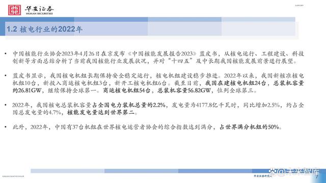 中國核能行業(yè)協(xié)會2023年4月26日在京發(fā)布《中國核能發(fā)展報(bào)告2023》藍(lán)皮書,從核電運(yùn)行、工程建設(shè)、科技 創(chuàng)新等方面總結(jié)分析了當(dāng)前我國核能行業(yè)發(fā)展?fàn)顩r,并對“十四五”及中長期我國核能發(fā)展前景進(jìn)行展望。藍(lán)皮書顯示,我國核電機(jī)組長期保持安全穩(wěn)定運(yùn)行,核電機(jī)組建設(shè)穩(wěn)步推進(jìn)。2022年以來,我國新核準(zhǔn)核電 機(jī)組10臺,新投入商運(yùn)核電機(jī)組3臺,新開工核電機(jī)組6臺。截至目前,我國在建核電機(jī)組24臺,總裝機(jī)容量 約26.81GW,繼續(xù)保持全球第一。商運(yùn)核電機(jī)組54臺,總裝機(jī)容量56.82GW,位列全球第三。 2022年,我國核電總裝機(jī)容量占全國電力裝機(jī)總量的2.2%,發(fā)電量為4177.8億千瓦時(shí),同比增加2.5%,約占全國總發(fā)電量的4.7%,核能發(fā)電量達(dá)到世界第二。 此外,2022年,中國有37臺機(jī)組在世界核電運(yùn)營者協(xié)會的綜合指數(shù)達(dá)到滿分,占世界滿分機(jī)組的50%。