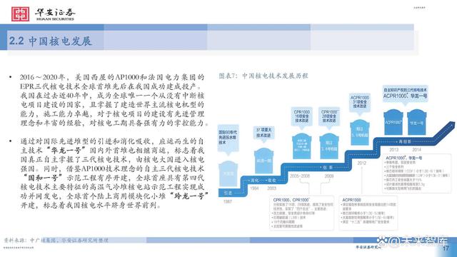 通過對國際先進(jìn)堆型的引進(jìn)和消化吸收,應(yīng)運(yùn)而生的自 主技術(shù)“華龍一號”國內(nèi)外首堆也相繼商運(yùn),標(biāo)志著我 國真正自主掌握了三代核電技術(shù),由核電大國進(jìn)入核電 強(qiáng)國。同時(shí),借鑒AP1000技術(shù)理念的自主三代核電技術(shù) “國和一號”示范工程有序開建,全球首座具有第四代 核電技術(shù)主要特征的高溫氣冷堆核電站示范工程實(shí)現(xiàn)成 功并網(wǎng)發(fā)電,全球首個(gè)陸上商用模塊化小堆“玲龍一號” 開建,標(biāo)志著我國核電水平躋身世界前列。