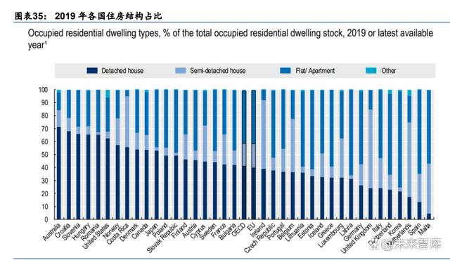 遠期空間:美國房屋結構具有天然優(yōu)勢,戶儲可利用屋頂面積高。戶用光伏和儲能設備通 常被安裝在家庭住房的屋頂上。因此,住房的類型、屋頂?shù)拿娣e大小等也直接決定了戶儲 的安裝難度和長期安裝需求,相對來說,獨立住房比高層樓房單戶房頂面積多,能夠安裝 更多戶儲,結構也更適合當前的分布式戶儲設備。根據(jù) OECD,美國 2019 年獨立住房和半 獨立住房的占比接近 70%,在統(tǒng)計的多個國家中排行第 6 名。根據(jù)美國經(jīng)濟分析局,2022 年美國人口 3.34 億,我們保守估計獨棟住房 6000 萬套,按 10%的滲透率、平均每戶 10kWh 計算,戶儲容量約為 600GWh,戶儲市場遠期想象空間大。