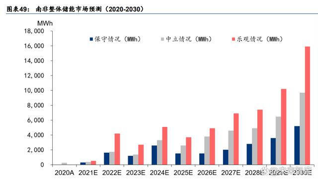 政策刺激疊加電力危機,南非戶儲市場增長預計有可持續(xù)性。為了緩解電力危機,南非政 府宣布 2023 與 2024 年全國電價將分別調(diào)漲 18.56%與 12.74%,以此來抑制居民用電需求。 從 23 年最新數(shù)據(jù)來看,23 年 1-7 月中國向南非出口逆變器累計 31.08 億元,同比+487.7%; 平均價格 2152.0 元/臺,同比 22 年 1-7 月+105.6%,中國出口南非逆變器價量雙升??紤] 到南非亦在跟隨全球腳步逐步擺脫煤炭發(fā)電依賴,燃煤電站大規(guī)模建設受阻,電力問題短 期無法解決,我們認為南非儲能市場的高增速具有較好的持續(xù)性。根據(jù)世界銀行預測, 2020-2030 年南非儲能電池裝機的年復合增速在 34%-50%之間,在悲觀/中性/樂觀場景假 設下,2030 年南非儲能電池裝機量將達到 5.2/9.7/15.9GWh。