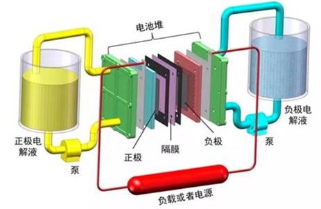 ——工作原理。液流電池通過(guò)離子選擇膜的離子交換將化學(xué)能轉(zhuǎn)化為電能,離子選擇膜將兩種液體電解質(zhì)分開(kāi)存儲(chǔ)在不同的罐中,利用兩種化學(xué)溶液進(jìn)行離子交換來(lái)進(jìn)行充放電,其電壓一般在1.0-2.2V之間。與其它電池相似,液流電池的功率與隔膜面積成正比,而儲(chǔ)存能量的多寡和溶液儲(chǔ)存容量成正比。