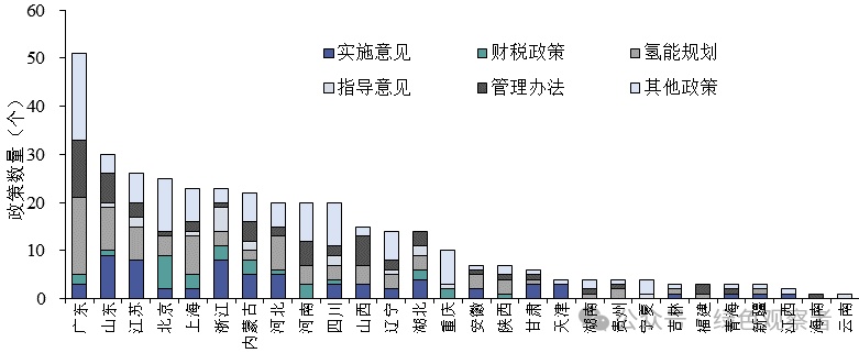圖3 中國(guó)各省市氫能產(chǎn)業(yè)各領(lǐng)域政策分布資料來(lái)源:根據(jù)氫能產(chǎn)業(yè)大數(shù)據(jù)平臺(tái)檢索所得(檢索時(shí)間2023年9月14)。