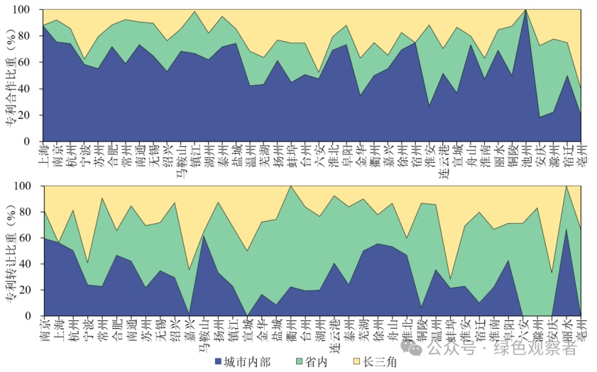 圖4 長(zhǎng)三角不同空間尺度的氫能專利合作及專利轉(zhuǎn)讓占比資料來(lái)源:根據(jù)incopat專利數(shù)據(jù)庫(kù)進(jìn)行專利檢索所得。注:部分城市未發(fā)生氫能專利合作及專利轉(zhuǎn)讓事件,故數(shù)據(jù)為零或未體現(xiàn)。